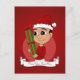 Carte postale de vacances avec l'illustration d'un joli garçon hispanique/latino ou asiatique souriant joyeux, il porte un casquette de Noël rouge et blanc et tient un cadeau de Noël; avec un modèle texte modifiable pour votre nom ou message, un modèle de vacances de Noël avec un arrière - plan rouge