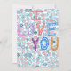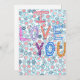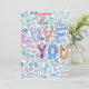 Cette oeuvre colorée décrit "I LOVE YOU" en lettres audacieuses et dessinées à la main et remplies de motifs cardiaques complexes. Chaque lettre est de couleur unique (rouge, violet, bleu et orange), ce qui ajoute de la vigueur à la pièce. L'arrière - plan se compose d'un motif d'hexagones en nid d'abeille, chacun rempli de motifs distincts et créatifs comme des tourbillons, des fleurs et des formes géométriques dans des tons doux rose, gris et bleu.