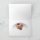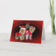 Deux adorables chiots Yorkshire Terrier habillés de vêtements de Noël se tiennent sous une branche de Mistletoe sur un fond de rouge et de noir sur la carte de Noël.