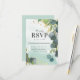 Cartes de réponse de mariage vertes élégantes avec un fond délavé à l'aquarelle, des feuilles de eucalyptus botaniques, des éclaboussures de faux foil doré et un modèle simple de rsvp de mariage.