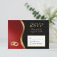 Une carte RSVP noire rouge et or. Anneaux de mariage joints pour un anniversaire ou une autre occasion.