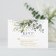 Elégante aquarelle moderne Botanical Greenery Wedding Carte RSVP comprend des feuilles d'eucalyptus, un feuillage botanique vert, des feuilles bleus poussiéreux et d'autres belles verdure botanique. Douton bleu foncé, Texte or