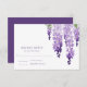 Carte RSVP Watercolor Wisteria présente d'élégantes fleurs de glycine à l'aquarelle en lavande douce et violette avec des feuilles verts sur un arrière - plan blanc avec vos informations RSVP Wedding à gauche. Personnalisez en modifiant le texte dans les zones de texte. Conçu pour vous par Evco Studio www.zazzle.com/store/evcostudio