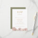 Ce boho tropical botanique | demande de chant vert olive carte RSVP est parfait pour votre élégant mariage d'or rose, vert, pêche, floral, vert. Le design présente un cadre or ou un bouquet avec de l'herbe rose pâle moderne, de la sauge simple, de l'ivoire, une feuille de palmier à champagne et une végétation de plage classique. Les fleurs peuvent inclure rose rose et orchidée. Le design est idéal pour un classicisme vintage en terre cuite, beige, rouille, hiver, printemps, mariage de automne. Veuillez trouver d'autres articles de papeterie mariage correspondants ou coordonnés dans le reste de la collection.