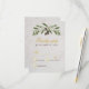 Les mots "Kindly reply" et le M initial sont écrits dans un script calligraphique doré. Le reste est écrit en majuscules. La ligne pour le nom et les emplacements circulaires à remplir sont d'un faux papier doré. Au-dessus de tout, il y a une branche d'olivier avec des feuilles vertes et des olives noires. Le fond est en marbre blanc.
