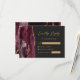 Cette carte RSVP de mariage chic et moderne comporte une bordure d'aquarelle rouge bordeaux et découpée avec une fausse parties scintillant d'or sur un arrière - plan noir en ardoise. Le texte est en calligraphie moderne couleur or et sans serif, avec des espaces pour les noms et les réponses des invités. L'envers est assorti d'un design d'agate bordeaux et or.
