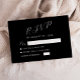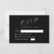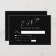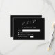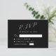 Cette élégante carte de boîtier RSVP mariage moderne présente du texte blanc sur un arrière - plan noir. Le titre "RSVP" apparaît dans un magnifique script de calligraphie, avec le texte personnalisable ci-dessous en sans serif police. L'envers est noir solide.