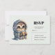 Carte RSVP avec une jolie illustration d'un chouette en robe d'hiver et foulard tenant un café chaud.