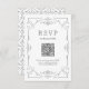 Design de cadre en volute orné d'élégance vintage en noir et blanc charbon. Motif damassé avec monogramme au dos, moderne, élégant et chic, parfait pour un mariage vintage, un mariage Art déco toute l'année. Couleur de fond modifiable pour correspondre aux couleurs de votre thème de mariage. Personnalisez votre propre carte de réponse QR code pour votre invitation de mariage.
