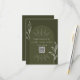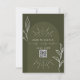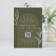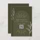 Mariage RSVP avec schéma de couleur verte, arc, texte blanc et détails de la ligne botanique. Remplacez le code QR par le vôtre.