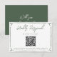 A simple and elegant calligraphy wedding scannable RSVP card. That is dark moss green and white with hand drawn frame and customizable QR code in the middle . Minimalist and chic with green typography .