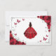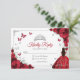 Red silver and white Quinceanera RSVP reply card. Features brunette girl in ball gown dress, script font, silver butterflies, red roses and tiara. Perfect for an elegant princess style glam celebration. Personalize with your own details.
