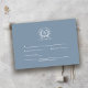 Il s'agit d'une carte de réponse rsvp de mariage élégant, formel, classique et botanique crête et monogramme en bleu poussiéreux.