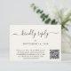 Elégante carte RSVP de mariage crème légère avec "réponse gentille" dans un script chic swash. Entrez l'adresse de votre site Web mariage pour créer un code QR numérisable que vos invités peuvent analyser en ligne vers RSVP. Au verso, vous trouverez votre photo superposée avec vos prénoms et date mariage, unis avec un coeur.