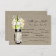 Carte de réponse RSVP assortie parfaite pour un mariage de style champêtre ou peut-être que vous aimez simplement les pots Mason ! Pot Mason suspendu à un crochet rempli de fleurs sauvages champêtres. Fond en toile de jute couleur tan rustique avec le pot Mason suspendu et des fleurs sauvages de couleurs blanc, jaune crème et vert chartreuse. Si vous avez des questions sur ce design ou si vous souhaitez une modification de couleur, veuillez m'envoyer un email à paula@labellarue.com. Consultez également les cartes de RSVP, de RÉCEPTION et de PLACEMENT DES INVITÉS pour assortir !