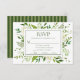 Cette carte RSVP charmante et élégante avec de belles hydrangées blanches, pleines de sagesse et d'étonnantes feuilles vertes et un dos rayé vert coordonné est parfaite pour envelopper avec vos invitations. Vos invités trouveront facile de répondre à votre mariage. C'est un excellent choix pour n'importe quelle mariée du printemps ou de l'été. Vous pouvez facilement vous débrouiller seul en sélectionnant Personnaliser ce modèle et en tapant votre date limite de réponse. En quelques secondes, vous verrez vos cartes RSVP uniques et étonnantes! De plus, la sélection des entrées vous aidera à vous restaurer à la réception.