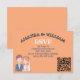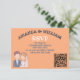 La carte RSVP de mariage présente une charmante illustration d'une mariée et d'un marié. Le marié est représenté avec des cheveux bruns courts, un teint clair, et porte une veste de costume bleu marine sur une chemise bleu clair et une cravate blanche. Il a une petite boutonnière épinglée sur son revers. La mariée se tient à côté de lui, souriant doucement. Elle a des cheveux ondulés, rougeâtre-oranges, ornés d'une couronne de fleurs rose, orange et blanche. Un délicat voile blanc coule derrière elle. Elle porte une robe mariage blanche avec un collier d'amoureux et un collier de perles. Cette illustration simple, en forme de dessin animé, suggère un lien amoureux des cordes entre eux. C'est fantaisiste et attachant, donnant un ton joyeux au prochain mariage. Le texte est gardé le moins possible pour un sentiment général simple où l'amour est le seul élément important ! Tous les champs sont entièrement personnalisables. Arrière - plan orange.