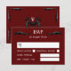 Carte RSVP de mariage d'inspiration imaginaire rouge foncé en rouge avec dragons noirs et détails blancs et polices avec choix de repas que vous pouvez personnaliser pour convenir à votre menu mariage. Le dos est doté d'un monogramme de dragon avec deux dragons noirs formant un coeur avec leurs ailes.