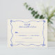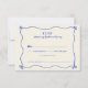 Ajoutez une touche de fantaisie et de nostalgie à votre papeterie mariage avec notre carte RSVP Whimsical Blue Wedding Rétro manuscrite. Conçue pour compléter notre thème Rétro Rétro Rétro à la main Whimsical Blue Mariage, cette carte RSVP allie charme vintage et élégance ludique. Le design manuscrit apporte une touche personnelle et intime à la carte, évoquant un sentiment de chaleur et d'authenticité. La palette de couleurs bleues fantaisie insuffle au design un sens du plaisir et de la nostalgie, donnant le ton pour une célébration joyeuse. Conçues avec soin et imprimées sur des cartons de haute qualité, nos cartes RSVP sont à la fois élégantes et fonctionnelles, assurant ainsi à vos invités une réponse facile à votre invitation. Que vous planifiez un mariage à la plage, une aventure dans le jardin ou une fête rustique, cette carte RSVP saura ravir vos invités et laisser une impression durable. Invitation vos proches pour participer aux festivités avec notre carte RSVP de mariage Whimsical Bleu Rétro manuscrit et laissez l'excitation commencer!