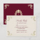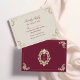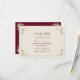 Carte de réponse élégante en bourgogne et or avec des fioritures baroques ornées et un monogramme luxueux au dos. Ce design classique complète parfaitement une suite de mariage formelle ou vintage. Les invités peuvent facilement indiquer leur présence et leurs préférences de repas. Idéal pour les mariages d'automne ou d'hiver, se combinant parfaitement avec les invitations, les cartes de détails et les menus assortis de la même collection.
