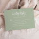 This simple modern wedding RSVP enclosure card features white text on a sage green background. The title appears in stylish handwriting calligraphy. Customize the remaining text in sans serif font. The reverse side is solid sage green.