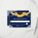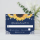 Rustic navy blue and sunflower wedding RSVP card featuring sunflowers and string lights against rustic burlap background adorned with white floral lace. Perfect card design to complement your navy blue rustic wedding party inspired by sunflower flowers.
