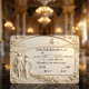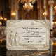 Set the tone for your formal estate wedding with this artistic design featuring a monochromatic ivory palette and a classical faux stone sculpture aesthetic.This design utilizes a trompe l'oeil technique to simulate the depth and shadow of a 3D bas-relief sculpture. The scene depicts a romantic couple walking along a cobblestone path toward a distant country chapel, framed by an ornate architectural arch and intricate rose borders. The color palette is strictly monochromatic, utilizing shades of cream, ivory, and soft grey to mimic the look of carved limestone or plaster. The typography features a formal black serif font for the header, paired with an elegant script, ensuring high contrast against the light stone-effect background.