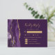 Le bord gauche de cette élégante carte d'enceinte RSVP de mariage moderne comporte une bordure d'aquarelle violette ornée d'une parties scintillant en faux or. Le titre "Kindly Reply" apparaît dans un script d'écriture manuscrite de couleur or, avec le reste du texte dans des polices en cuivre et en italique sur un riche arrière - plan de prune. Inclut des espaces pour que vos invités puissent commencer leur choix de trois entrées modifiables. L'envers est assorti d'une agate violette et dorée.