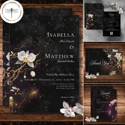 Dévoilez la mystique de votre histoire d'amour avec notre carte de réponse gothique mariage sans options de dîner. Ce design somptueux et enchanteur présente un design noir et blanc qui évoque l'essence d'une romance intemporelle. Les délicates orchidées blanches et dorées occupent le devant de la scène sur un mystérieux ciel étoilé noir. L'élégance sombre est accentuée par le texte blanc. Ce design est une fusion artistique de beauté et de drame, promettant de donner un ton envoûtant à votre journée spéciale. Choisissez ce design pour créer un mariage aussi unique et inoubliable que votre amour. Créé par Simply Farmhouse Press, il fait partie de la Suite Mariage Dark Gothic Black & White Orchid Spells.