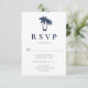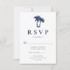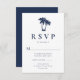 Carte de réponse Palmier Plage Tropicale Navy avec une paire de palmiers tropicaux et une typographie moderne pour une sensation propre et minimaliste. Le modèle est facilement personnalisable avec les détails de votre choix de repas.