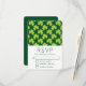 Une carte RSVP avec un motif extensible mignon avec des trèfles vert olive sur un arrière - plan vert foncé.