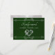 Design features an elegant emerald green background embellished with a delicate silver scroll heart and dividers. Stylish script place holders for the date are on the front, and response information on a white pearl back. Perfect for the simple to most elegant wedding. Also available with different colored backgrounds for your wedding theme colors. Designed to coordinate with the "Romantic Scroll Hearts & Calligraphy" Wedding Collection. To change details, click «Personalize». To move the text or change the text size, font, or color click «Click to customize further»