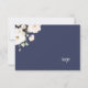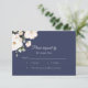 Roses blanches simples et délicates sur le coin supérieur gauche de cette élégante carte de réponse violet, détails de personnalisation en typographie grise. Le dos de la carte rsvp présente le même agencement floral, en plus de la typographie rsvp personnalisable.