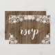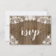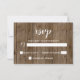 L'avant de cette charmante carte RSVP rustique est ornée d'une bordure en faux dentelle blanche encadrant les lettres minuscules "rsvp" dans un script de calligraphie blanc moderne sur un arrière - plan en bois de grange. À l'envers, sur la même image en bois de grange, le titre et la lettre "M" avant l'espace pour le nom de l'invité apparaissent en écriture blanche, avec le texte restant dans la police blanche sans serif. Des boîtes blanches sont fournies pour répondre à vos invités. Customisez le texte avec votre date de réponse préférée et acceptez/refusez le libellé.