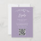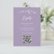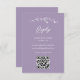 Cette belle carte de réponse mariage rustique présente un joli arrière - plan violet lavande avec un brin fleur sauvage dessiné à la main et une élégante typographie en blanc. Modifiez le code QR en utilisant votre propre URL de site Web mariage afin que vos invités puissent répondre en ligne. C'est le design parfait pour un mariage rustique mais élégant et se coordonne parfaitement avec notre suite Fleur sauvage rustique... voir la collection design pour plus d'articles.
