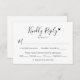 Elégante calligraphie moderne Les cartes RSVP de mariage noir et blanc présentent un design de typographie élégant avec un script de calligraphie chic, la mariée à l’envers et le nom du marié avec un accent de coeur d’amour romantique. Texte personnalisé minimaliste pouvant être personnalisé avec la date d'échéance RSVP. Le design comprend une ligne pour le(s) nom(s) d'invité(s), la participation à l'événement, le choix de repas et le nombre total d'invités présents.