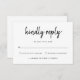 Laissez vos invités RSVP dans le style avec cette carte RSVP moderne avec un script écrit à la main audacieux. Le design informel et élégant crée un ton accueillant, tandis que la disposition claire avec des options de réponse et un espace réservé pour le nombre d'invités assure un processus RSVP lisse et sans effort. Cette carte RSVP est le complément parfait à vos invitations de mariage modernes.