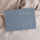 Cette simple carte de boîtier RSVP mariage moderne présente du texte blanc sur un arrière - plan bleu poussiéreux. Le titre apparaît dans la calligraphie stylisée d'écriture manuscrite. Customisez le texte restant dans la police sans serif. L'envers est bleu poussiéreux et solide.