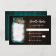 Carte RSVP de mariage turquoise rustique avec un bocal de maçon et deux coeurs de burlap avec initiales contre un arrière - plan de bois rustique. Personnalisez facilement cette jolie carte RSVP rustique turquoise en ligne.