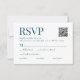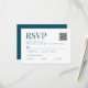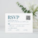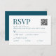 Elégante carte turquoise de mariage RSVP avec un code QR scannable pour le site Web et 3 choix de repas modifiables. L'exemple inclut des menus de viande, de poisson et de végétalien, mais peut être modifié en n'importe quel autre texte. Personnalisez-le avec votre propre texte.