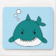 Cute cartoon blue and white shark with black ovals for eyes and big sharp pointed teeth. He is blowing white bubbles on a blue background.