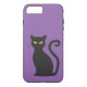 Cute and fun iPhone 8/7 Plus case with a cartoon black cat with yellow eyes on purple. Perfect for the cat lover.