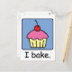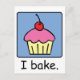 Cartoon food clip art with a yummy cupcake with frosting and a cherry on top and the words "I bake."