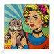 Cartoon Comic Pop Art Women Holding Cat Tile