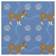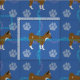Cute cartoon style Chihuahua stands against a background of blue with paw prints and tracks in grey, pink and blue.
