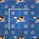Cartoon style Papillon leaping against a background of blue with paw prints and tracks in grey, pink and blue.