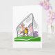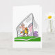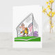 This is a fun cartoon style design of a goalkeeper. This goalkeeper has a mean determined look on his face as he stands in the soccer goal. The funny thing is he is holding a net to try and stop the balls but has failed as there is several soccer balls behind him. This cartoon goalkeeper design looks great on these greeting cards