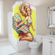 This shower curtain has a cartoon lady on it.