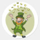 A cute cartoon leprechaun in traditional green suit and hat throws gold coins into the air.