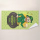 Bath Towel with an Illustration of a smiling leprechaun wearing a green suit, a bow-tie, and a bowler hat while sitting inside a pot o’ gold and holding a pint of beer, with yellow, green, and orange rainbow in the background. The image is placed over a seamless light green background with shamrocks.